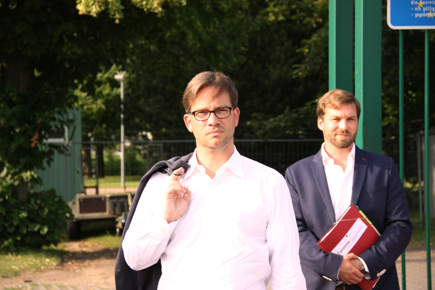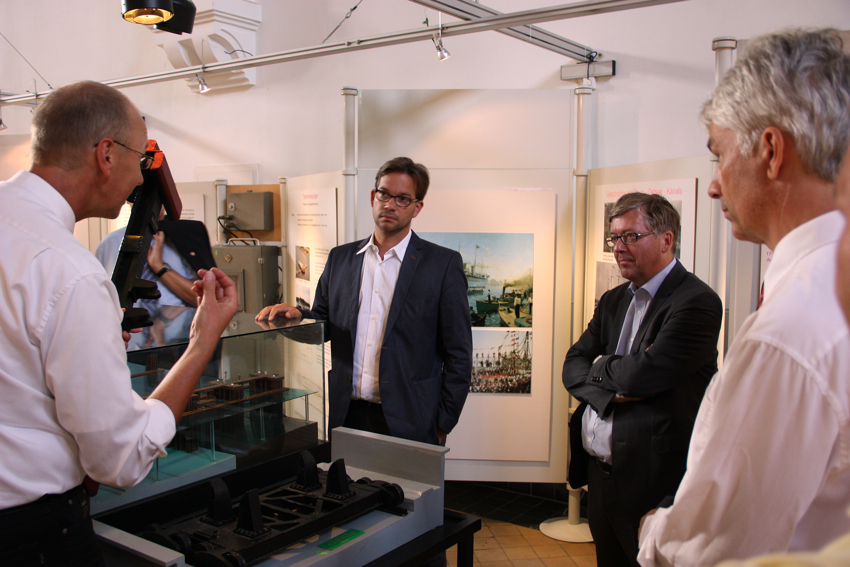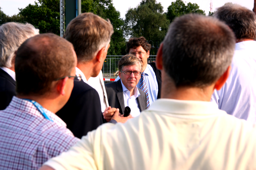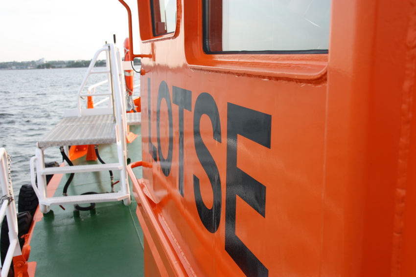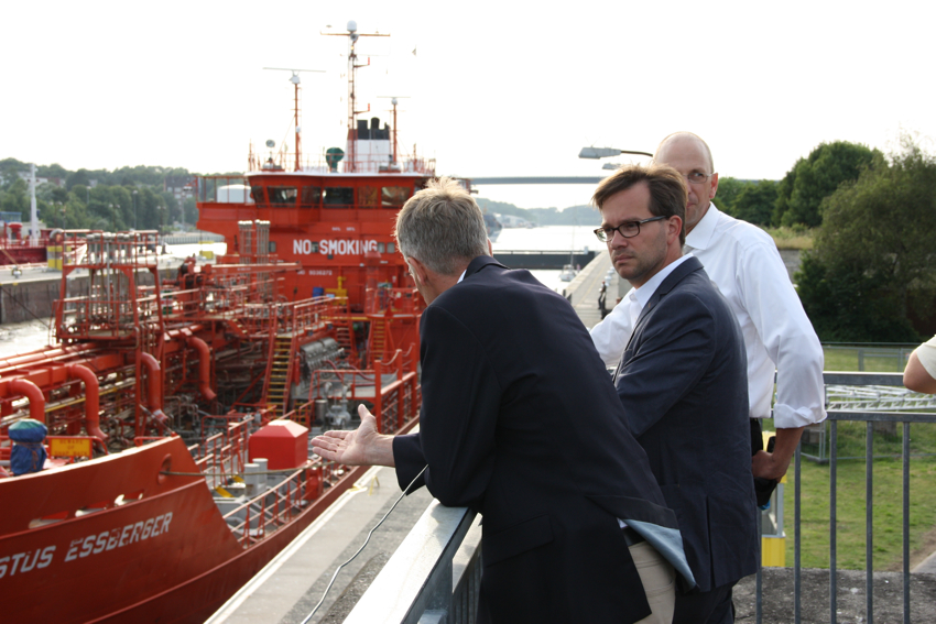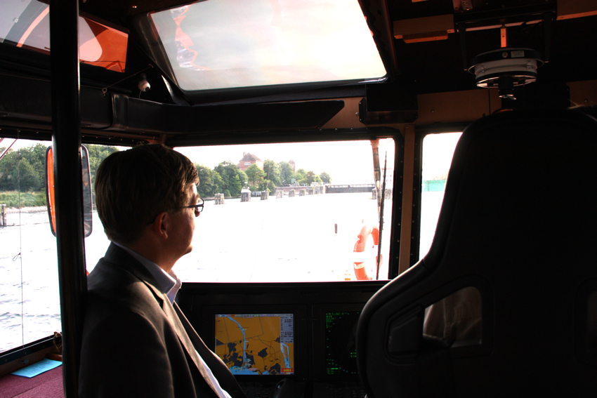 Nach der abendlichen Besichtigung der Holtenauer Schleuse zusammen mit Florian Pronold (Mitglied des SPD-Kompetenzteams), Landesverkehrsminister Meyer und Vertretern der Lotsen, WSA und der Initiative Kiel-Canal setzte die Delegation mit dem Lotsenboot Schilksee über zum Tiessenkai.